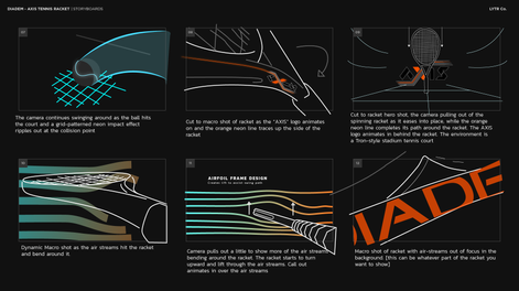 For Diadem's new racket, the Axis, they envisioned a glowy, neon, Tron inspired video. So I rewatched the original and the new Disney one for some inspiration. I came out of my Tron marathon with notes on light cycle paths and moody, reflective neon courts. They had also explained to me that the racket has a unique feature that acts as an air foil to create lift. So I thought some cool neon gradient wind-tunnel air streams would really help sell that feature.