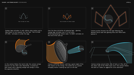 Diadem wanted to express 3 features of the racket in the video; the air foil feature that creates lift, and that lift adds more spin to the ball, and the location of the most dense part of the strings is moved up. I thought the light cycle effect from the Tron movies would be cool to show the tennis ball having a spin effect. The air foil tunnel with neon air streams would be a great way to show the lift feature of the racket.